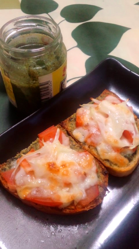 スライスしたパンにシソベーゼを塗り、トマトとたまねぎ、チーズを乗せて