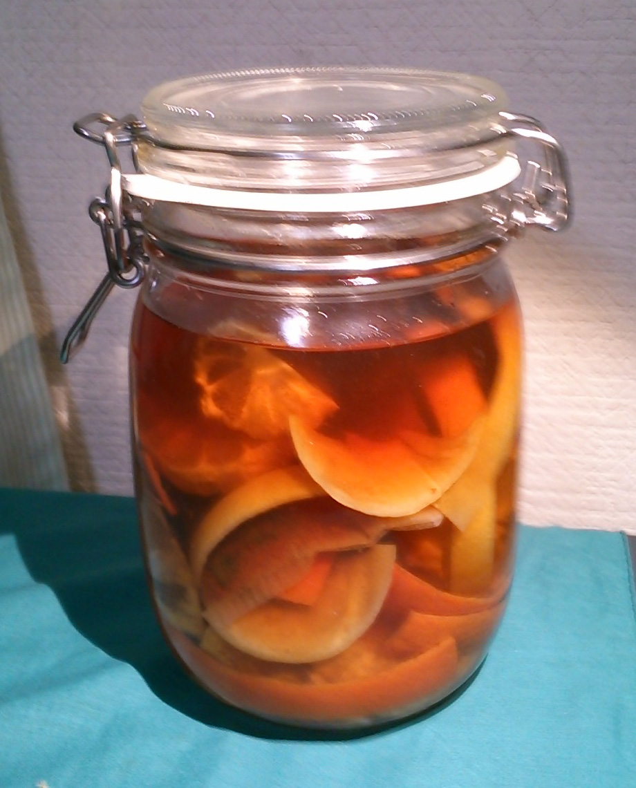 フルーツとハーブのパックをビンに入れて、ブランデーを注ぐ。