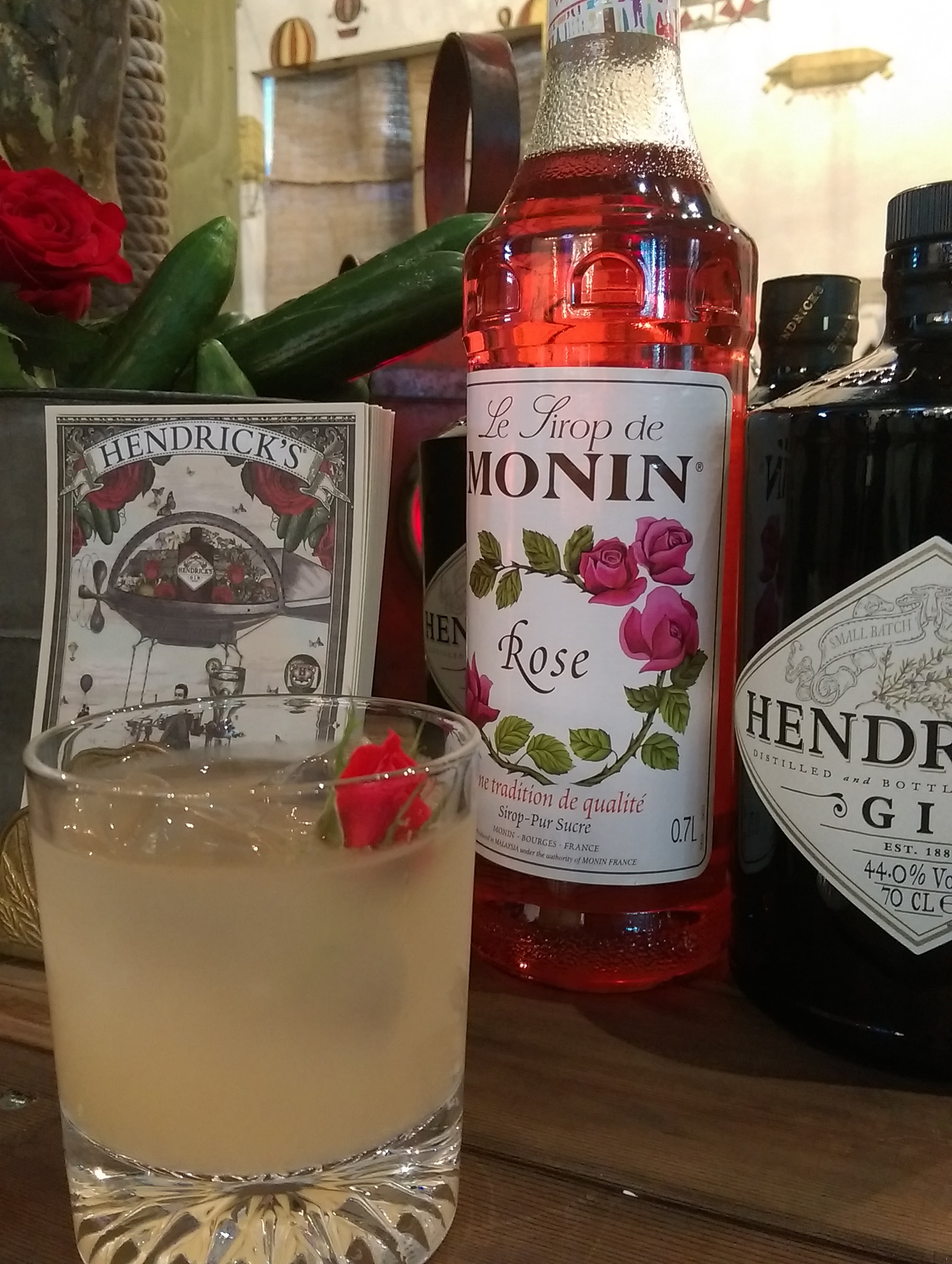 ロックグラスの方は、ジン+ローズシロップ+アップルジュース。ミニバラを添えて。