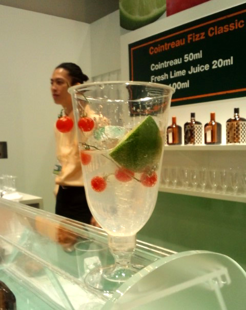 コアントローのブース。背面にコアントローの記念ボトル(リボンデザイン)も並んでる。